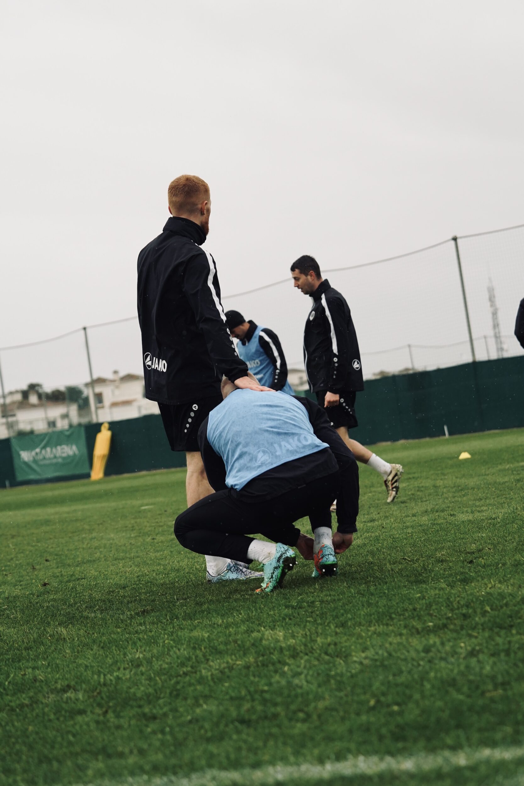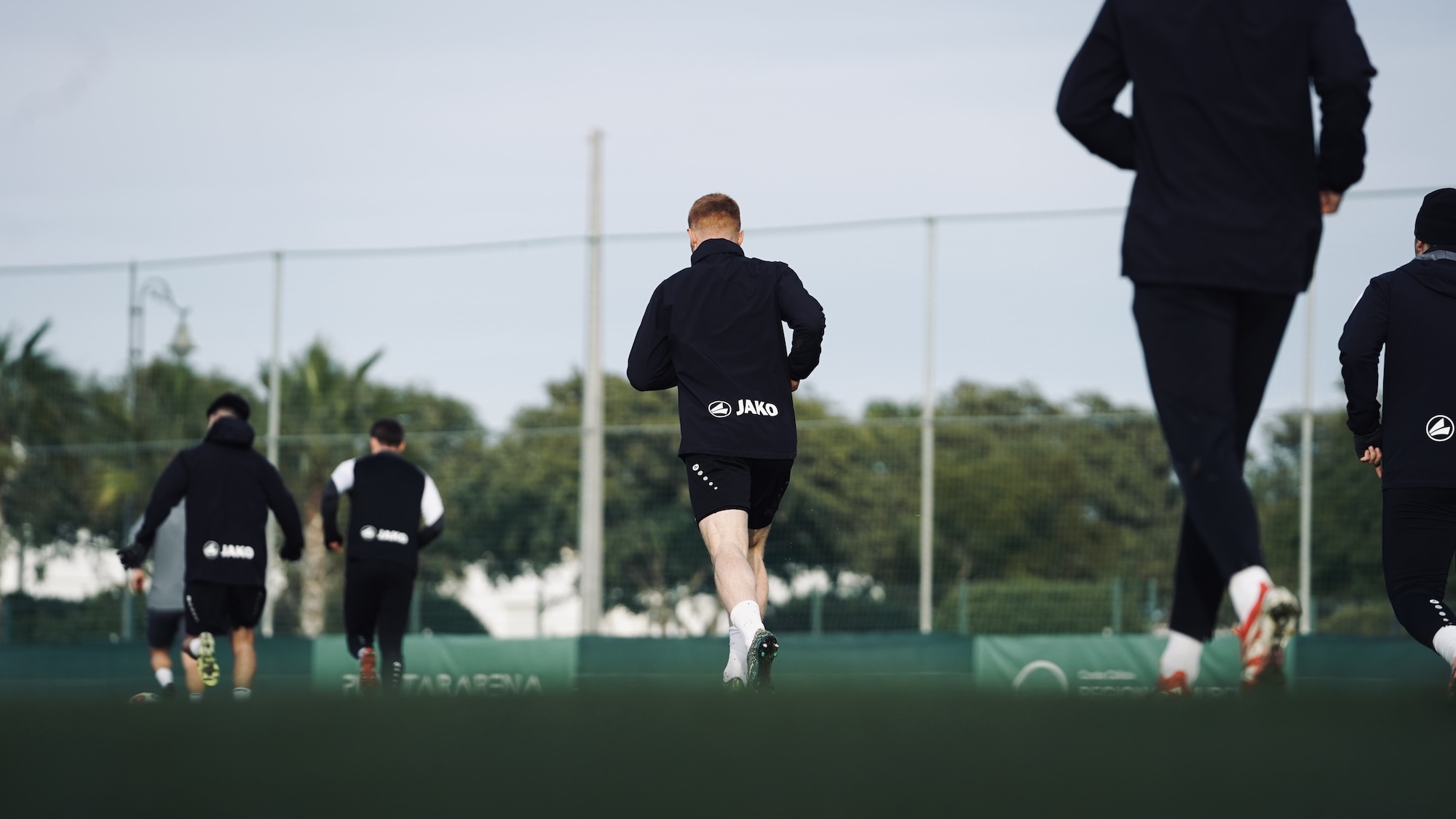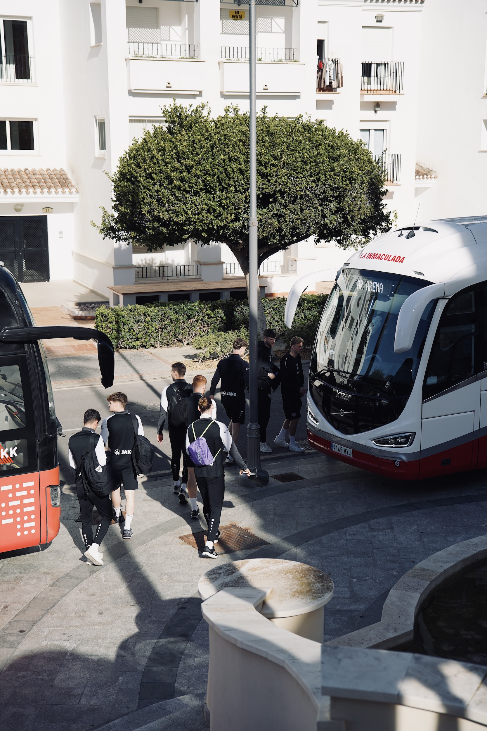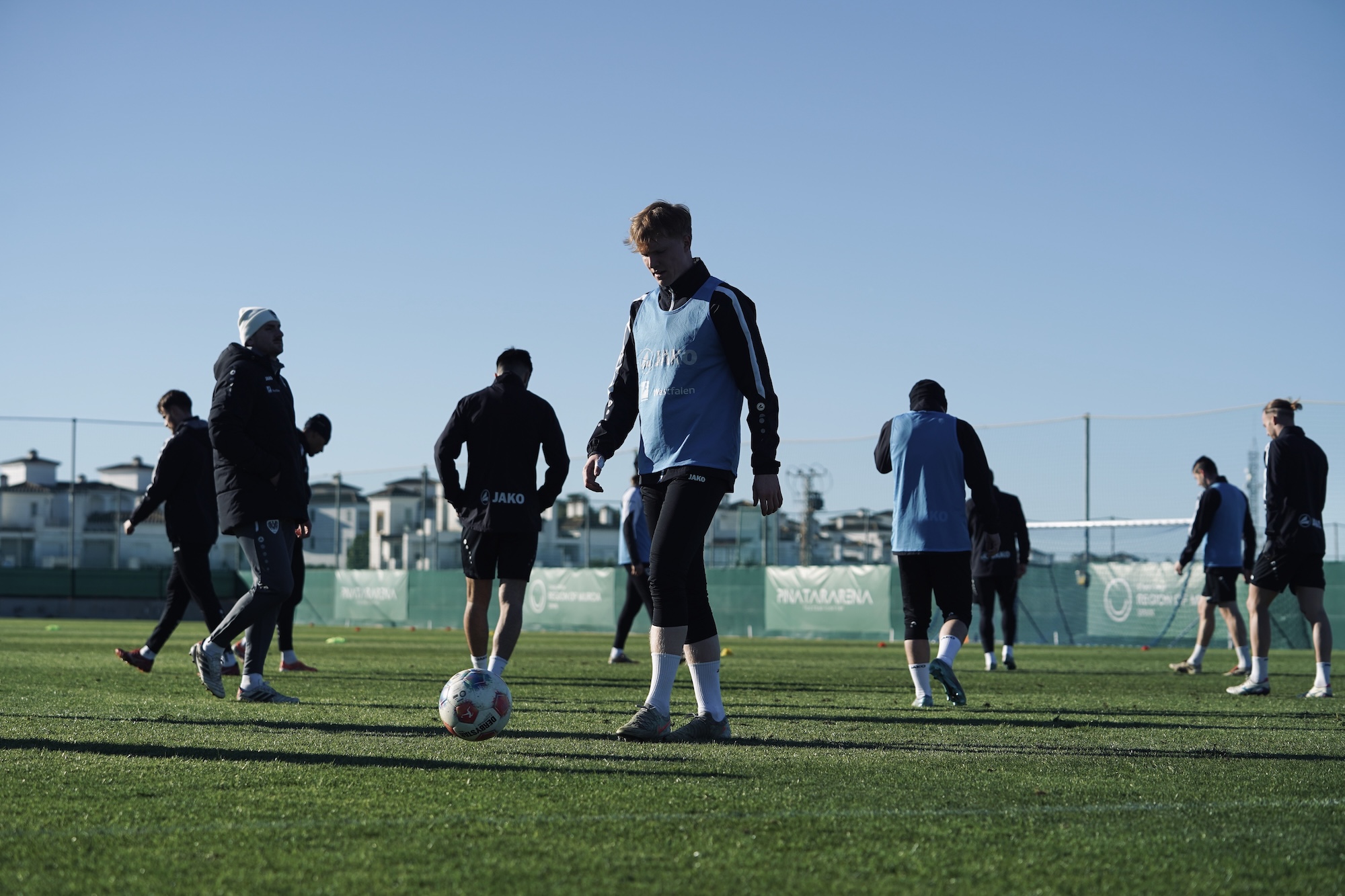 Nach der gut einstündigen Busfahrt zum Teamhotel und einem kurzen Snack ging es direkt auf den Trainingsplatz, um nach den freien Tagen und der Zeit im Flieger und im Bus etwa 60 Minuten lang dosiert in die Bewegung zu kommen. In den nächsten Tagen stehen dann täglich zwei Einheiten sowie das Testspiel gegen den belgischen Erstligisten Oud-Heverlee Leuven auf dem Programm