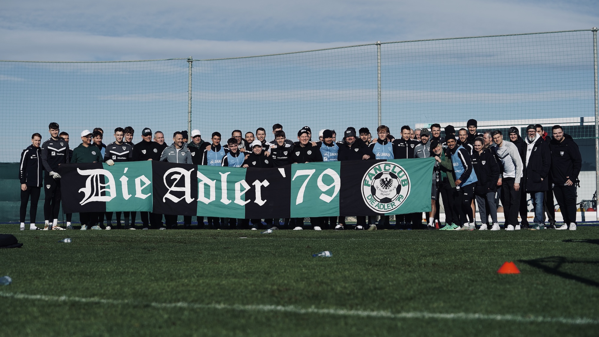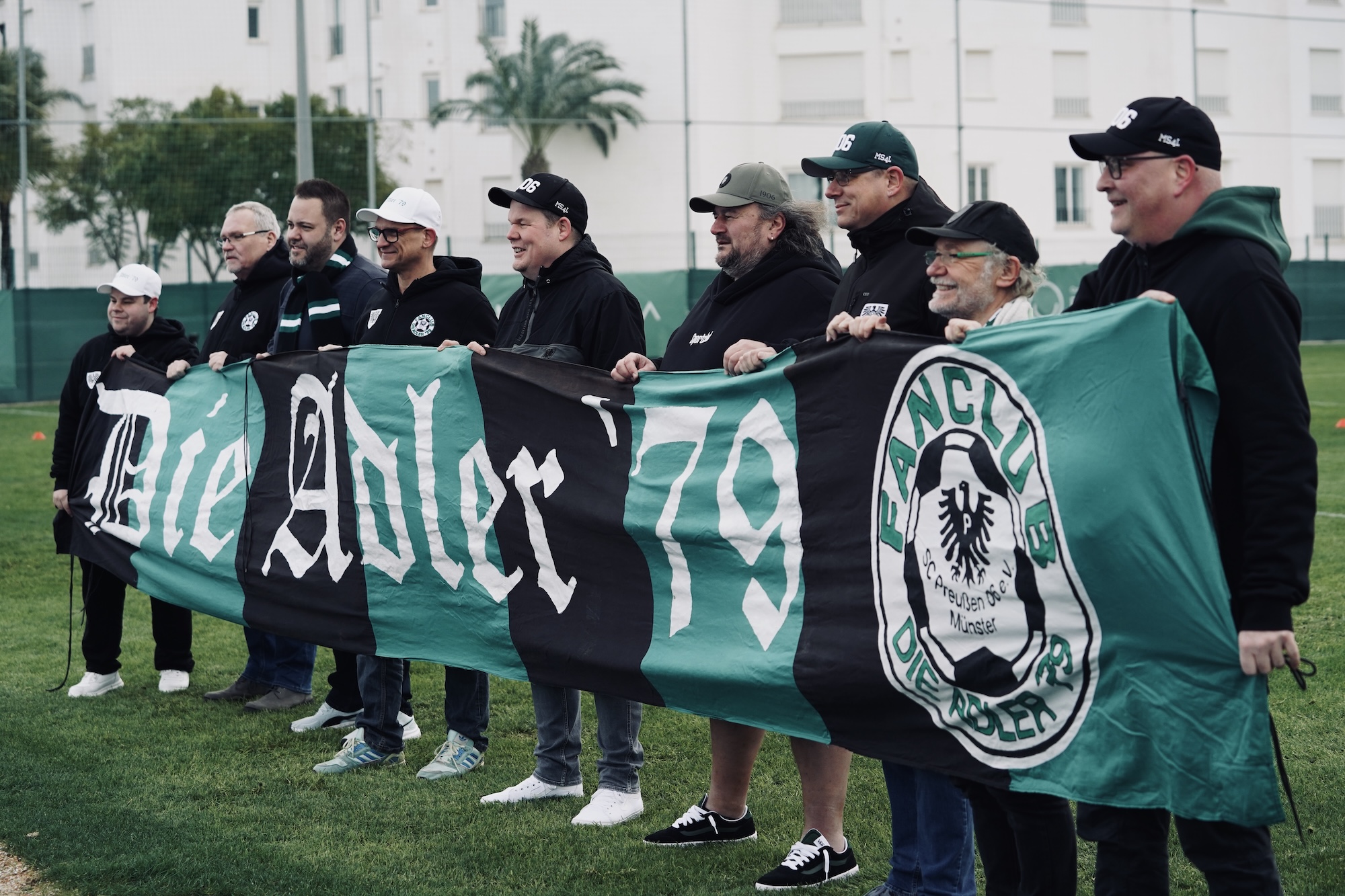 Nicht ganz eine Handvoll Preußenfans fand an den ersten beiden Trainingstagen den Weg zum Trainingsgelände, doch am Dienstagvormittag bekamen sie Unterstützung. Die „Adler ‘79“ – ältester Fanclub des SCP, waren am Montag mit einem halben Dutzend Mitglieder in Spanien gelandet und schauten am Dienstagvormittag beim Training vorbei. Ebenso wie Preußen-Urgestein Manni und sein Sohn Stipe, sowie drei weitere Wegbegleiter, wohnen sie in Appartements ganz in der Nähe des Teamhotels. Mit wärmeren Temperaturen hatten sicher alle gerechnet, doch die nächsten Tage versprechen auch für die Urlauber Besserung, ehe es für sie am Samstag zurück ins verschneite Münster geht.