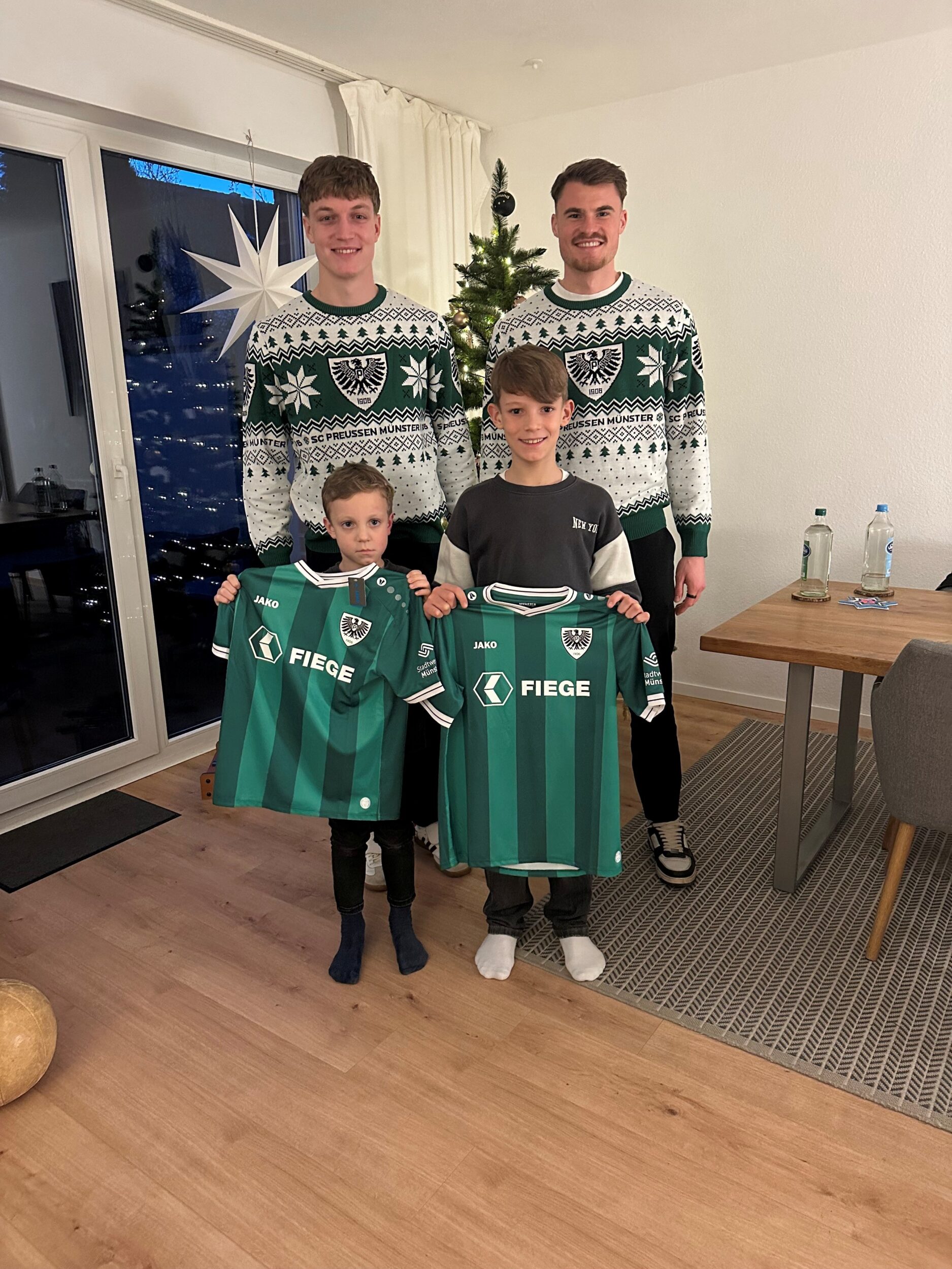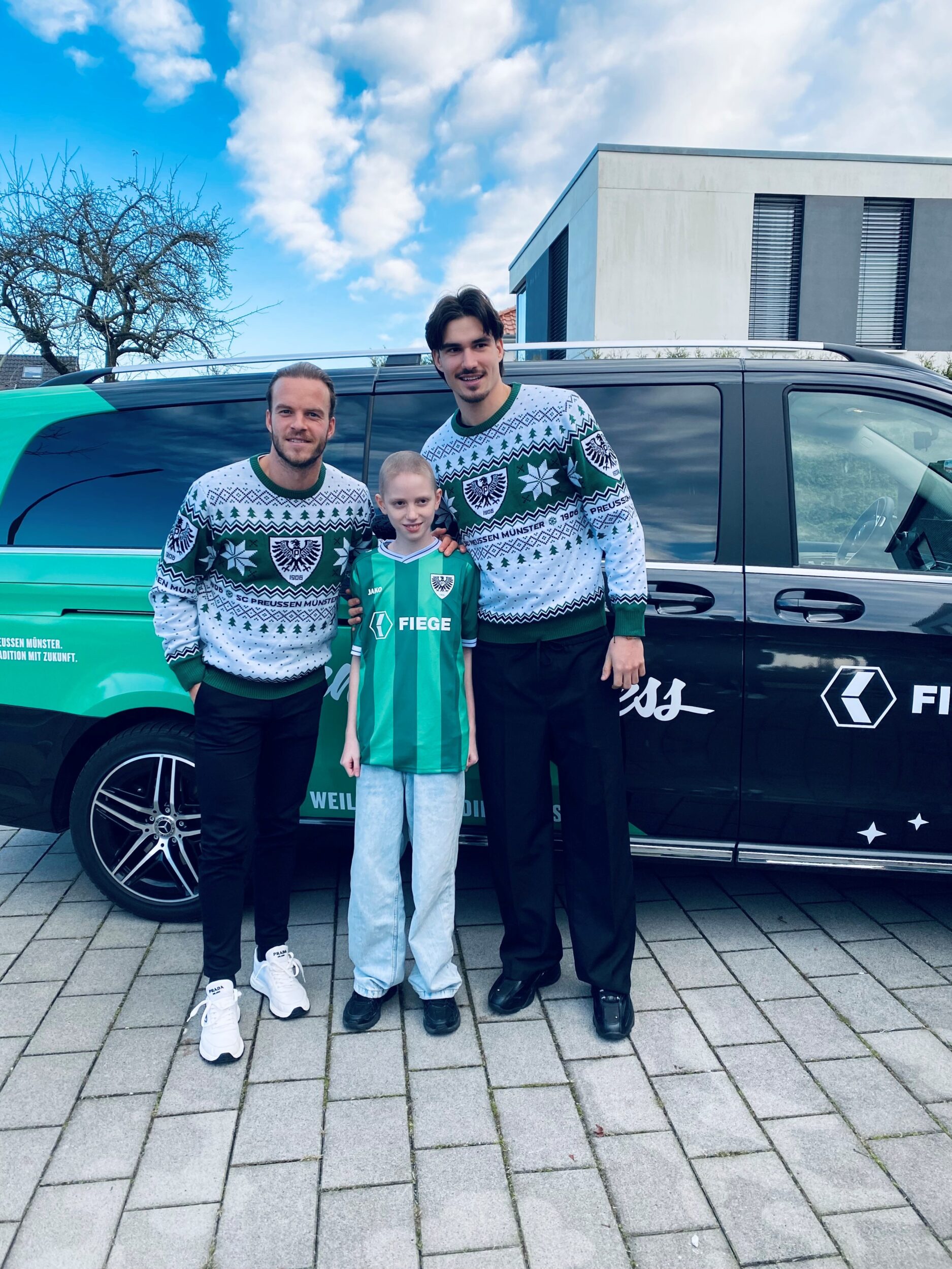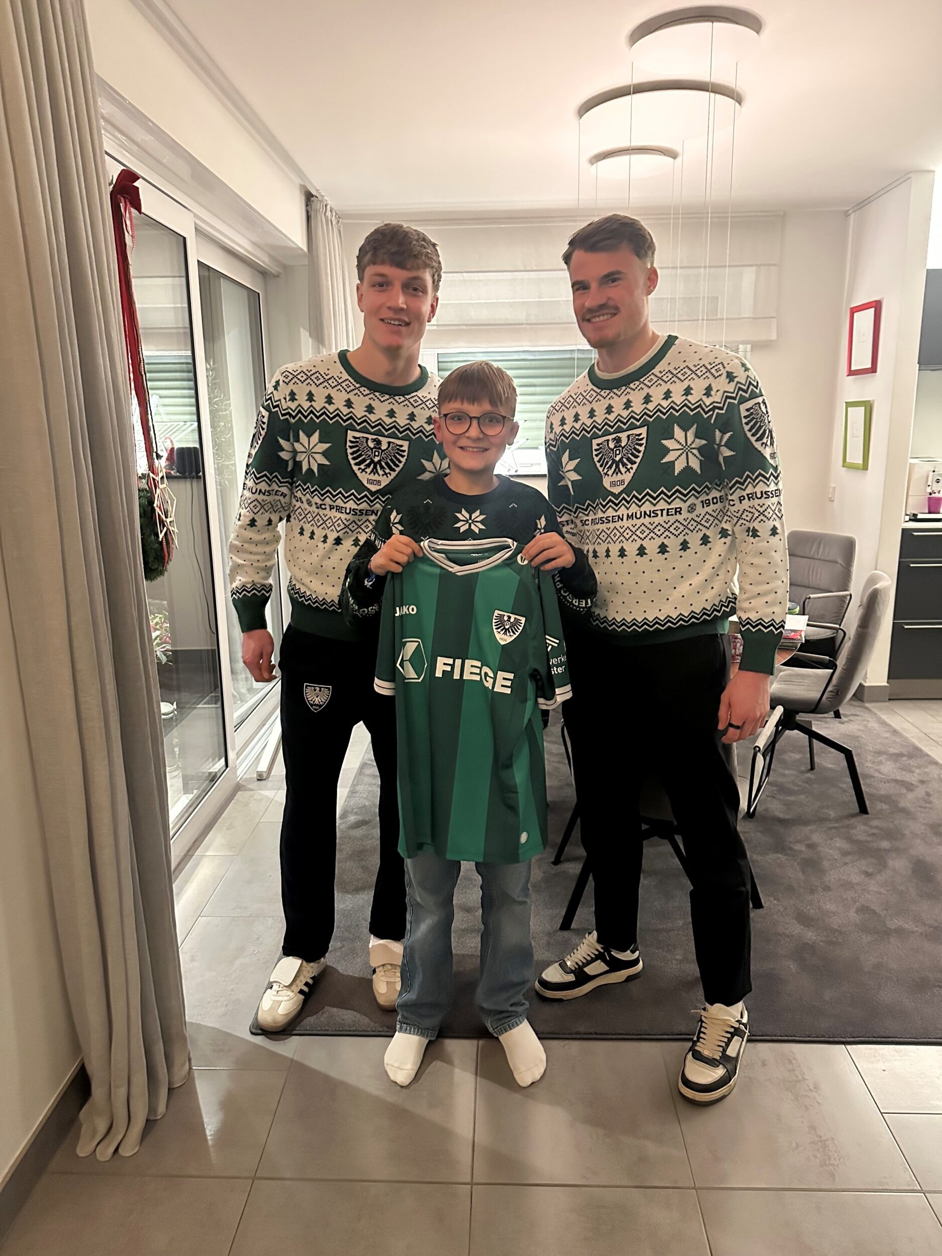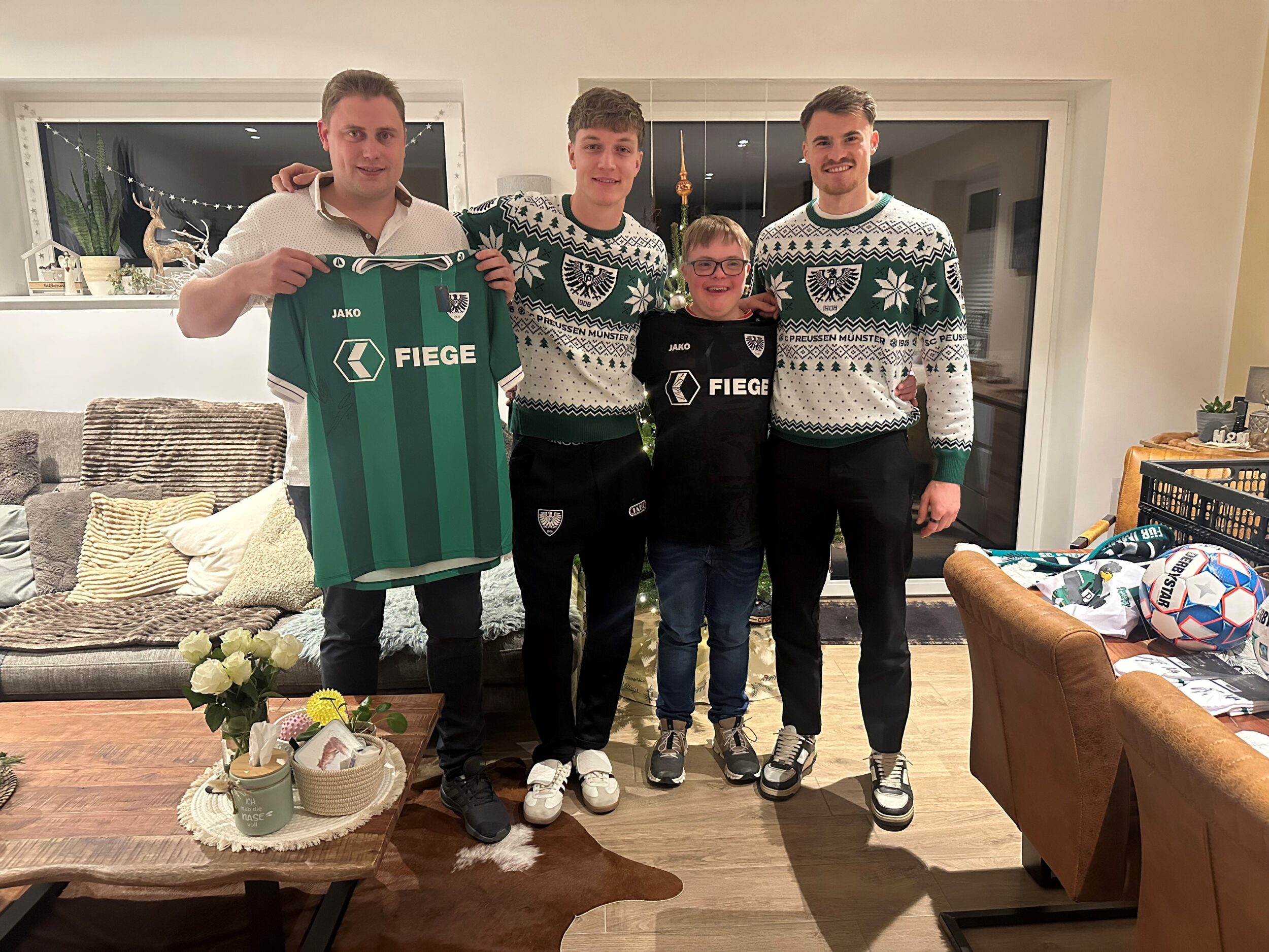 Bereits zum sechsten Mal ist der Fiege-Weihnachtsexpress in diesem Jahr wieder durch das Münsterland gerollt und hat Menschen besucht, die eine vorweihnachtliche Überraschung ganz besonders verdient haben. Mit an Bord: Die Preußen Jorrit Hendrix, Johannes Schenk, Antonio Tikvic und Niko Koulis. Erstmals aufgeteilt in Zweier-Teams haben sie sich die vier Adlerträger am vergangenen Montag auf den Weg gemacht, um mit dem Fiege-Weihnachtsexpress entlang einer mehr als 150 Kilometer langen Route von Münster über Ascheberg, Nordkirchen, Greven und Altenberge bis nach Everswinkel Menschen zu überraschen, die es in diesem Jahr nicht leicht hatten oder sich besonders für ihre Mitmenschen eingesetzt haben. Mit im Gepäck: je ein Heimtrikot des SC Preußen und ein Warenhaus-Gutschein im Wert von 800 Euro, die den überraschten Gewinnern inklusive privater Autogrammstunde überreicht wurden. Es gab viele überraschte Gesichter – und kleine Momente der Freude.